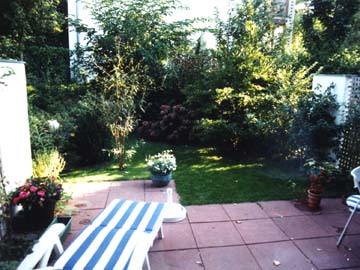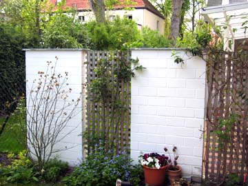 Als räumliche Abgrenzung wird die Terrasse mit Mauern einfasst. So entsteht Sicht- und Lärmschutz in der engen Nachbarschaft. Zur Auflockerung dienen Holzspaliere mit Eigenschaft als Rankhilfe.