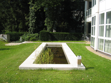 Ein Wasserbecken mit einer klaren Linienführung akzentuiert die Gartenanlage. Gebäude und Außenraum bilden eine harmonische Einheit. Heller Kalkstein als Einfassung gibt der Anlage ein elegantes Erscheinungsbild.