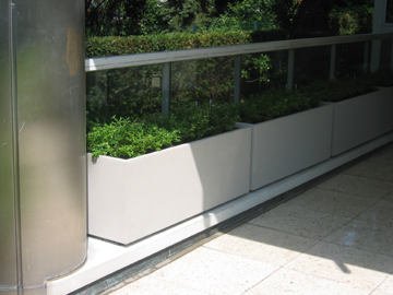 Individuell angefertigte Pflanzcontainer fassen die Terrasse. Durch den Maßeinbau ergibt sich ein perfekter Übergang zu dem Geländer. Das helle Grau fügt sich dezent in die vorhandene Struktur ein.