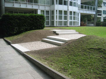 Ebenfalls aus hellem Kalkstein ist die Treppenanlage gefertigt. Auch hier zeigt der natürliche Stein seine feine und zurückhaltende Eleganz. Der Verlauf und die Steigung sind dem Gelände angepasst.Die Blockstufen sind maßgefertigt, die Podeste sind mit Kleinstein gepflastert.