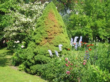 Garten Ende Juni: Frisch aufgeblüht der Rittersporn (Delphinum x cultorum ´Jubelruf´) zusammen mit der Brennenden Liebe (Lychnis chalcedonica). Im Hintergrund ein Bauernjasmin (Philadelphius coronarius), der dem gesamten Garten einen sommerlichen Duft verleiht.