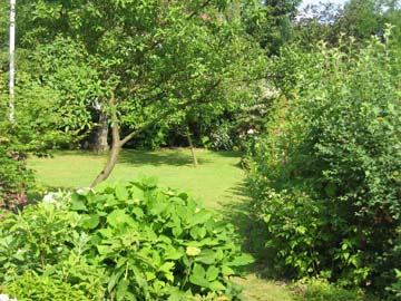 Zugang: Auch kleine Gärten beleben, indem sich Räume verdichten und öffnen. Über einen schmalen Weg erreicht man eine großzügige Rasenfläche, am Rande gesäumt mit Stauden und Schmuckgehölzen.