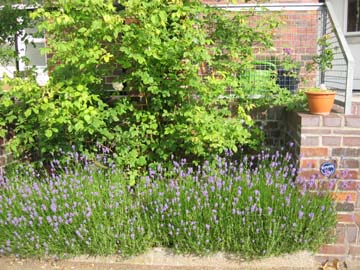 Vorgarten: Die klassische Kombination mit Rosen (New Dawn) und Lavendel. Kräftige Blütenfarben und intensiven Duft wird bei voller Sonne in Südlage erzielt.