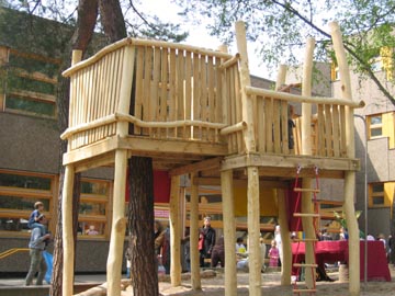 Baumhaus: Die Konstruktion besteht aus Robinienholz und hat ein Dach mit Bretterschalung. Für den Auf-und Abstieg lassen sich zahlreiche Elemente addieren: Rutschen, Kletterseile, Stangen oder Netze.