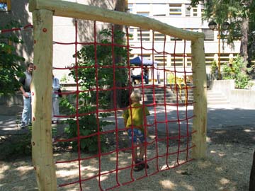 Kletter-Netz: Mit Robinienstämmen als Grundkonstruktion lassen sich herkömmliche Grundmodelle von Spielgeräten herstellen. Ohne aufwändige Farbgebung oder Applikationen haben die Geräte eine freundliche und natürliche Ausstrahlung.