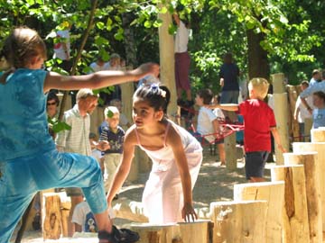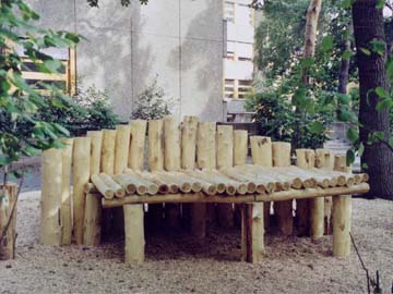 Lümmelbank: In die Palisadenreihe wurden Spielgeräte eingefügt. Hier eine Lümmelbank zum Sitzen, Klettern und als Höhle.